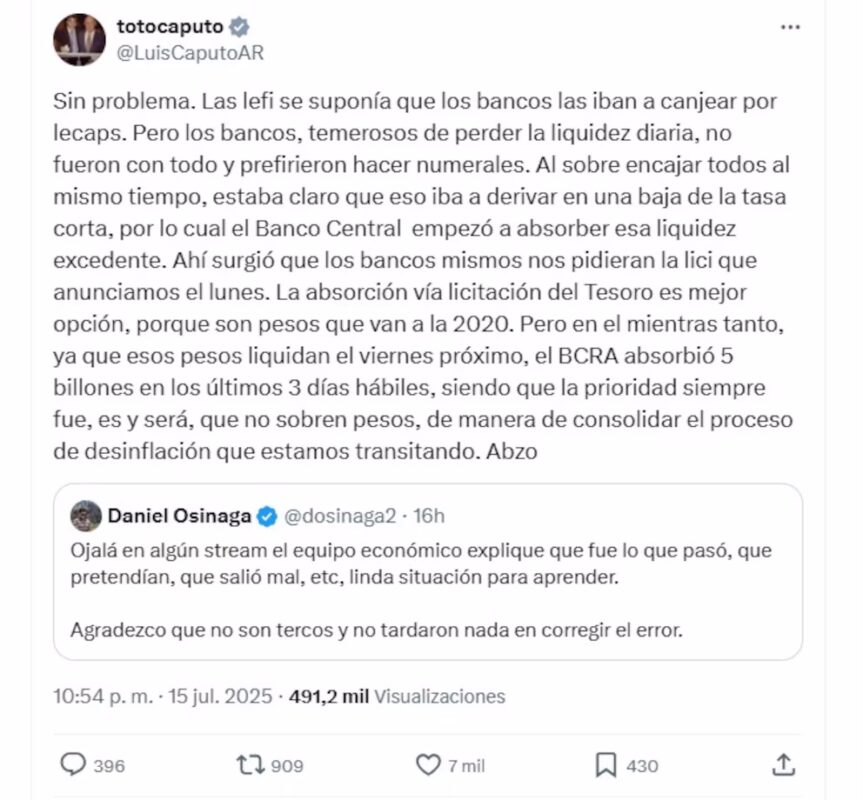 - Operaciones de pase pasivo del BCRA: la autoridad monetaria reabrió la “ventanilla” de pases pasivos, un instrumento que no utilizaba desde la adopción del esquema de flotación con bandas. Mediante estos pases, el BCRA retira pesos de los bancos ofreciéndoles a cambio una colocación a muy corto plazo (generalmente a 1 día, sí, un día) con un interés atractivo. El martes 15/7 reactivó este mecanismo en el mercado interbancario (rueda REPO), pagando inicialmente un 25% de tasa nominal anual por pesos a un día, luego 30% y hasta 36% anual en el transcurso de las horas, superando en 7 puntos la que había sido la tasa de referencia de su política monetaria hasta ese momento. Así, se absorbieron cerca de $4,3 billones ese día vía pases –y unos $5 billones en los tres días hábiles que rodearon a la crisis, según Caputo– retirando del mercado buena parte de los pesos provenientes del desarme de las LEFI.